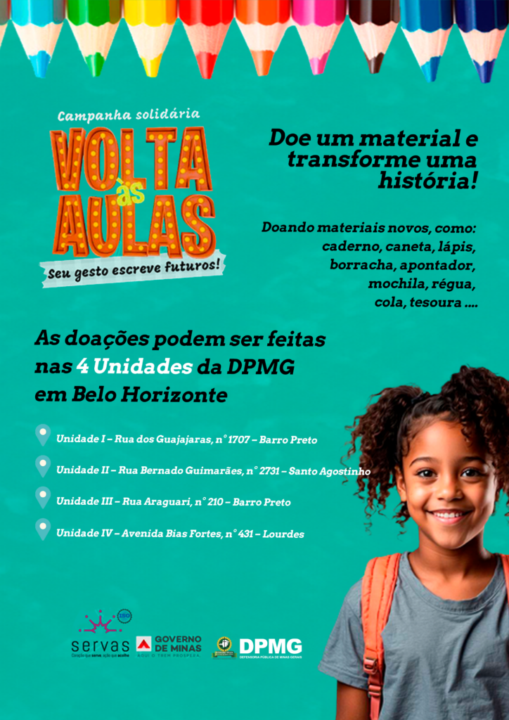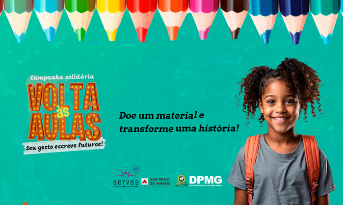 A Defensoria Pública de Minas Gerais (DPMG) aderiu à campanha Volta às Aulas 2026, mobilização solidária promovida pelo Servas, com o apoio de instituições públicas, empresas, escolas particulares e da sociedade civil, para fortalecer a educação e promover a equidade no acesso ao ensino para crianças e adolescentes em situação de vulnerabilidade social.