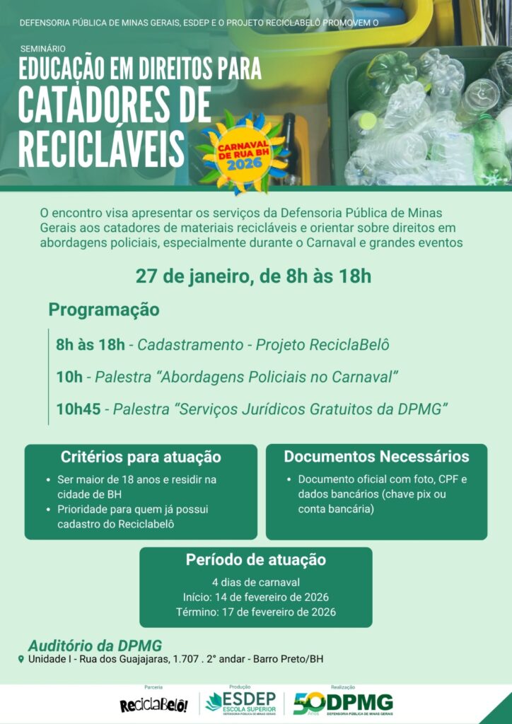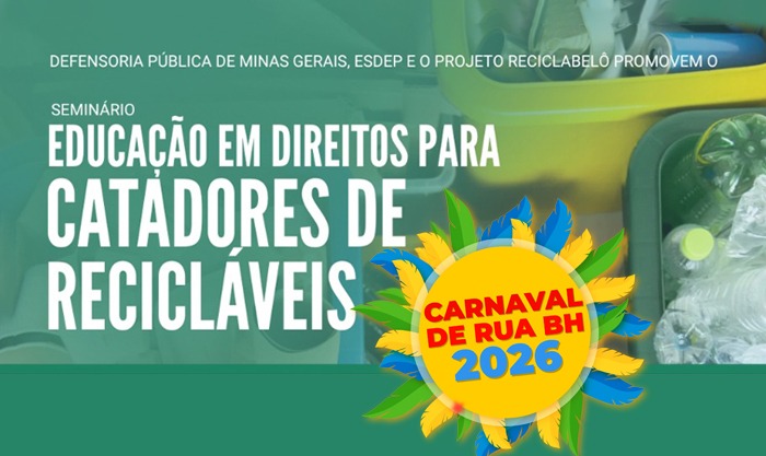 Carnaval 2026: cadastro de catadores do ReciclaBelô acontece na terça-feira, dia 27/1, na Defensoria Pública de Minas Gerais