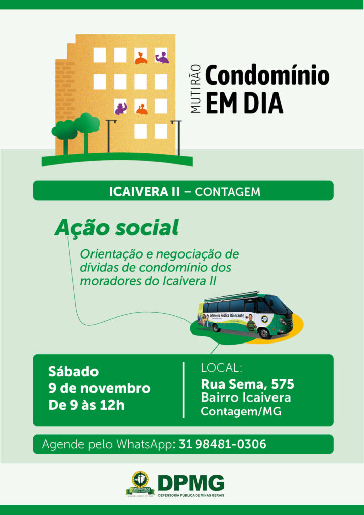 Na manhã do próximo sábado, a Defensoria Pública de Minas Gerais (DPMG) estará no bairro Icaivera, em Contagem, realizando mais uma etapa do Mutirão “Condomínio em Dia”. Além do atendimento itinerante da DPMG, haverá uma ação social organizada pela Prefeitura, oferecendo serviços de saúde, zoonose e assistência social, entre outros.