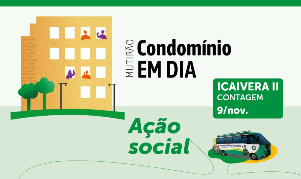 Na manhã do próximo sábado, a Defensoria Pública de Minas Gerais (DPMG) estará no bairro Icaivera, em Contagem, realizando mais uma etapa do Mutirão “Condomínio em Dia”. Além do atendimento itinerante da DPMG, haverá uma ação social organizada pela Prefeitura, oferecendo serviços de saúde, zoonose e assistência social, entre outros.