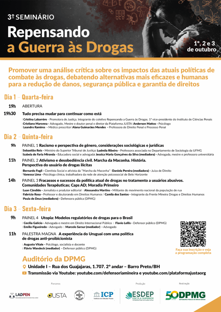 A Defensoria Pública de Minas Gerais (DPMG), por meio da sua Escola Superior (Esdep), promove, nos dias 1º, 2 e 3 de outubro, o 3º Seminário “Repensando a Guerra às Drogas”. O evento será realizado no auditório da Defensoria, em Belo Horizonte, com transmissão ao vivo pelo YouTube, e tem como objetivo fomentar uma análise crítica sobre os impactos das atuais políticas de combate às drogas, debatendo alternativas mais eficazes e humanizadas para a redução de danos, a segurança pública e a garantia de direitos.