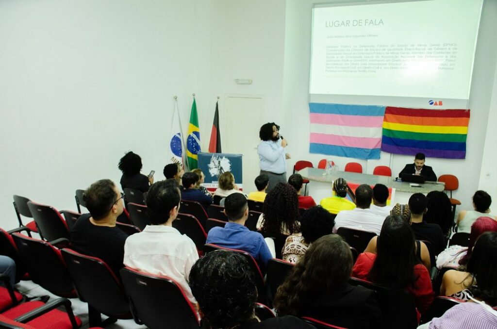 O defensor público João Mateus Oliveira (ao microfone) abordou as complexidades e os desafios enfrentados pela comunidade LGBTQIAPN+