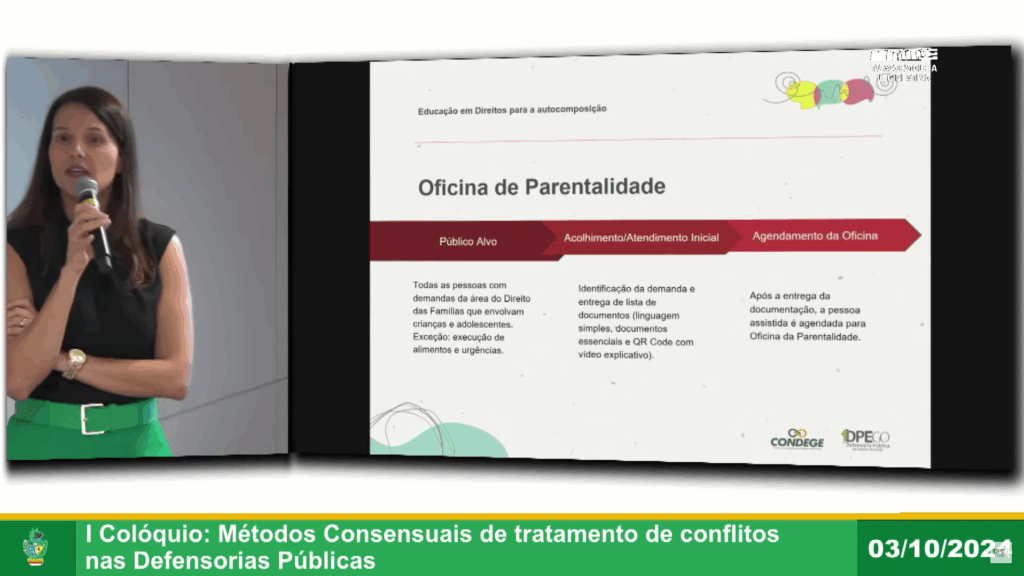 Ao detalhar a atuação da DPMG nesta área, Paula Regina Fonte Boa Pinto explicou como se dá o atendimento ao público assistido e destacou a importância dos Centros de Conciliação e Mediação da DPMG, seja em sua unidade na Capital ou naquelas onde já foi instalado no interior de Minas Gerais. Também pontuou os desafios enfrentados pela Instituição para implementá-los de forma efetiva. Atualmente, a Defensoria mineira conta com 23 Centros em funcionamento.