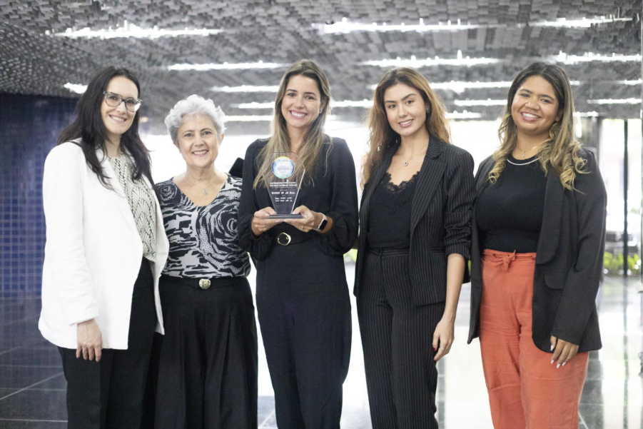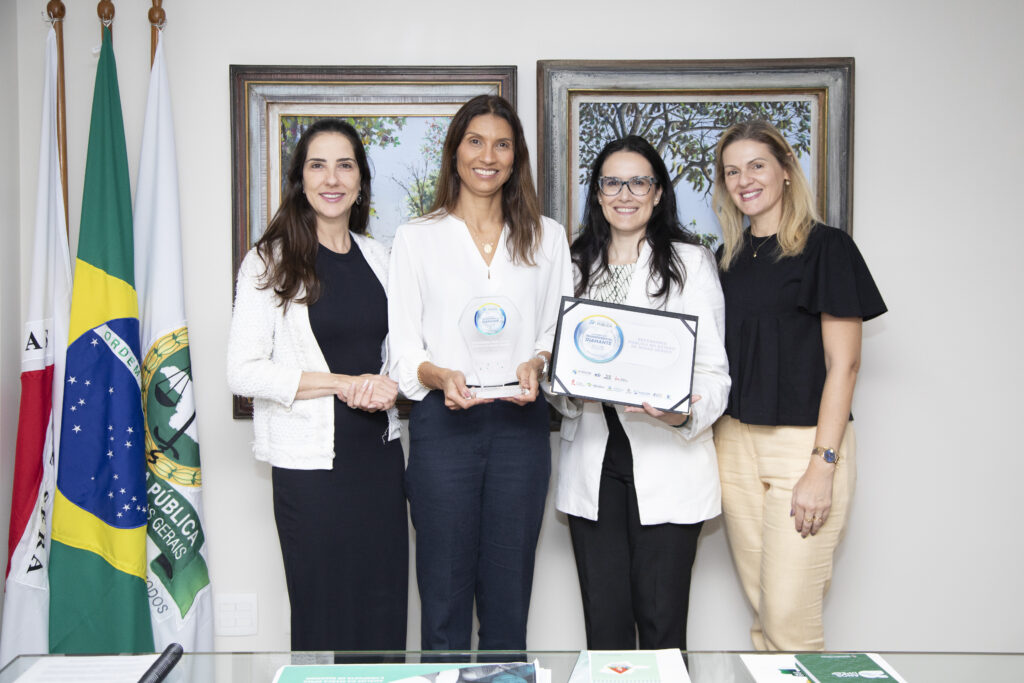 Pela DPMG, além da subdefensora pública-geral Administrativa, também participaram da cerimônia de premiação a auditoria interna Renata Kelly Cardoso de Rezende (ao centro), as analistas de auditoria Vania Mendonça Moreira e Giulia de Aguiar Simões e a representante da Ouvidoria-Geral, Anna Luiza Garandy Santos