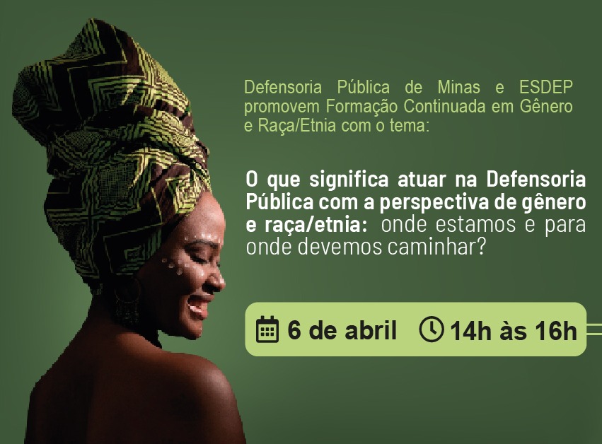 A Defensoria Pública de Minas Gerais, por meio de sua Escola Superior (Esdep-MG), oferecerá o “Curso de Formação Continuada em Gênero e Raça/Etnia: Uma Perspectiva Interseccional da Defensoria Pública”. A capacitação tem o apoio da Associação das Defensoras e dos Defensores Públicos de Minas Gerais (ADEP-MG).