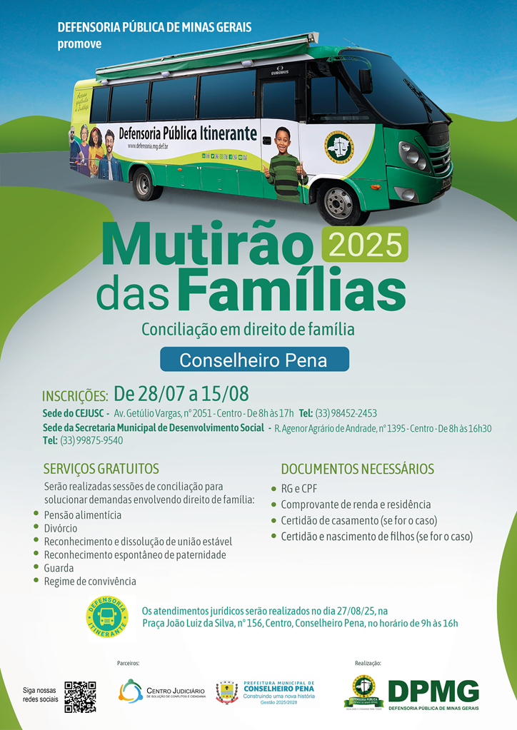 Esta ação da Defensoria Itinerante é uma realização da DPMG, por meio de sua Coordenadoria de Projetos, Convênios e Parcerias (CooProC), em parceria com o Tribunal de Justiça de Minas Gerais, por meio do Centro Judiciário de Solução de Conflitos e Cidadania (CEJUSC), e com a Prefeitura de Conselheiro Pena e de Goiabeira.