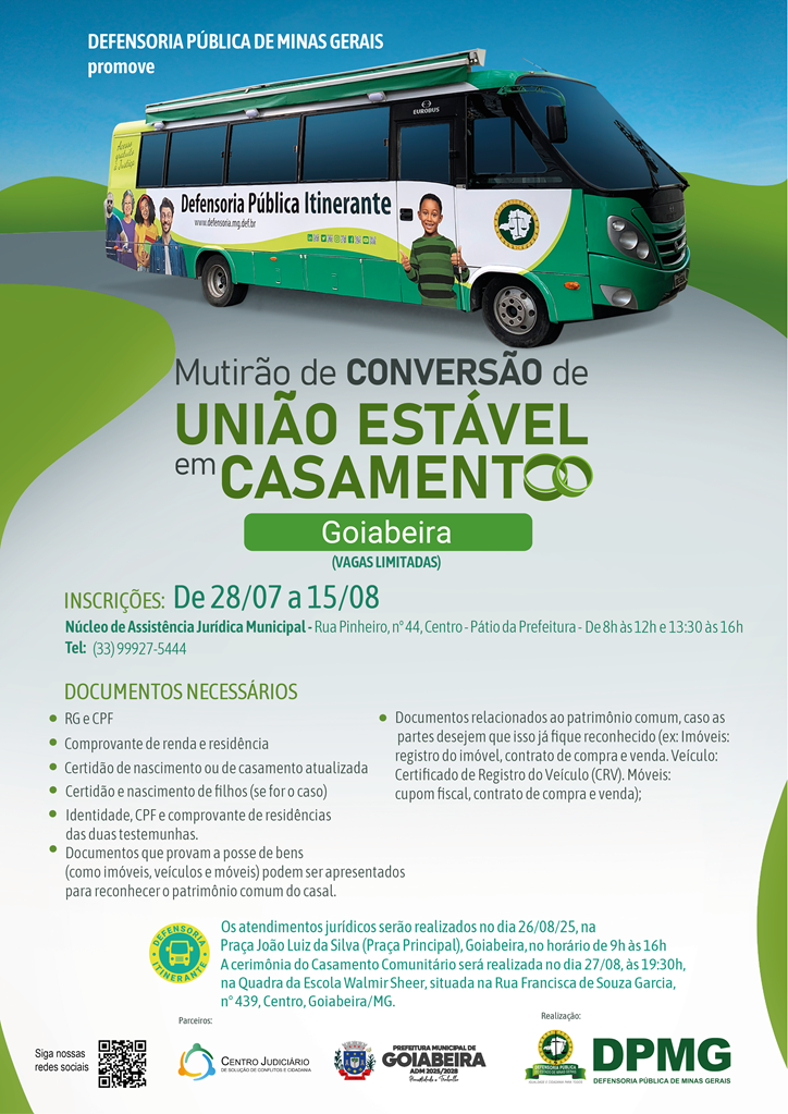 Os casais interessados, residentes em Goiabeira, podem se inscrever até o dia 15/8 no Núcleo de Assistência Jurídica Municipal, no endereço Rua Pinheiro, n° 44, Centro – Pátio da Prefeitura, das 8h às 12h e das 13h30 às 16h. Tel.: (33) 99927-5444.