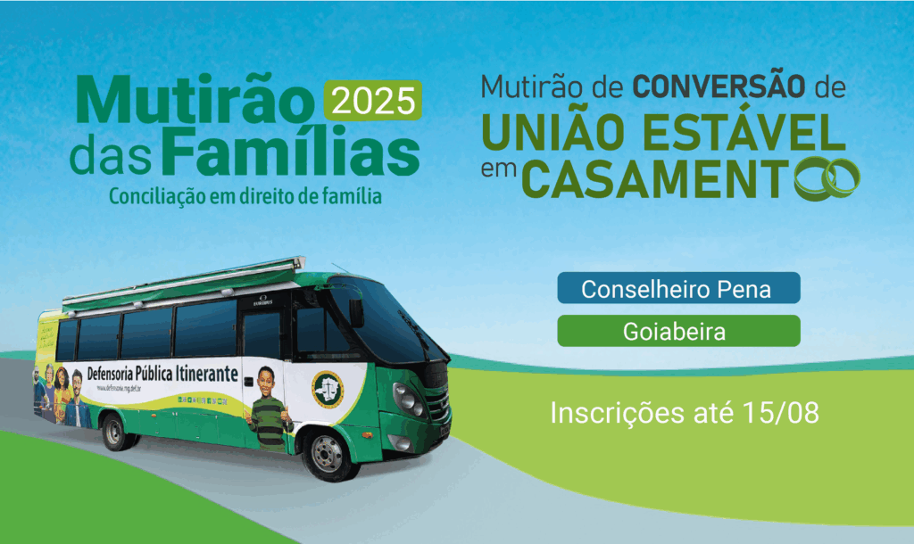 Em Conselheiro Pena será realizado o Mutirão das Famílias e, em Goiabeira, o Mutirão de Conversão de União Estável em Casamento.