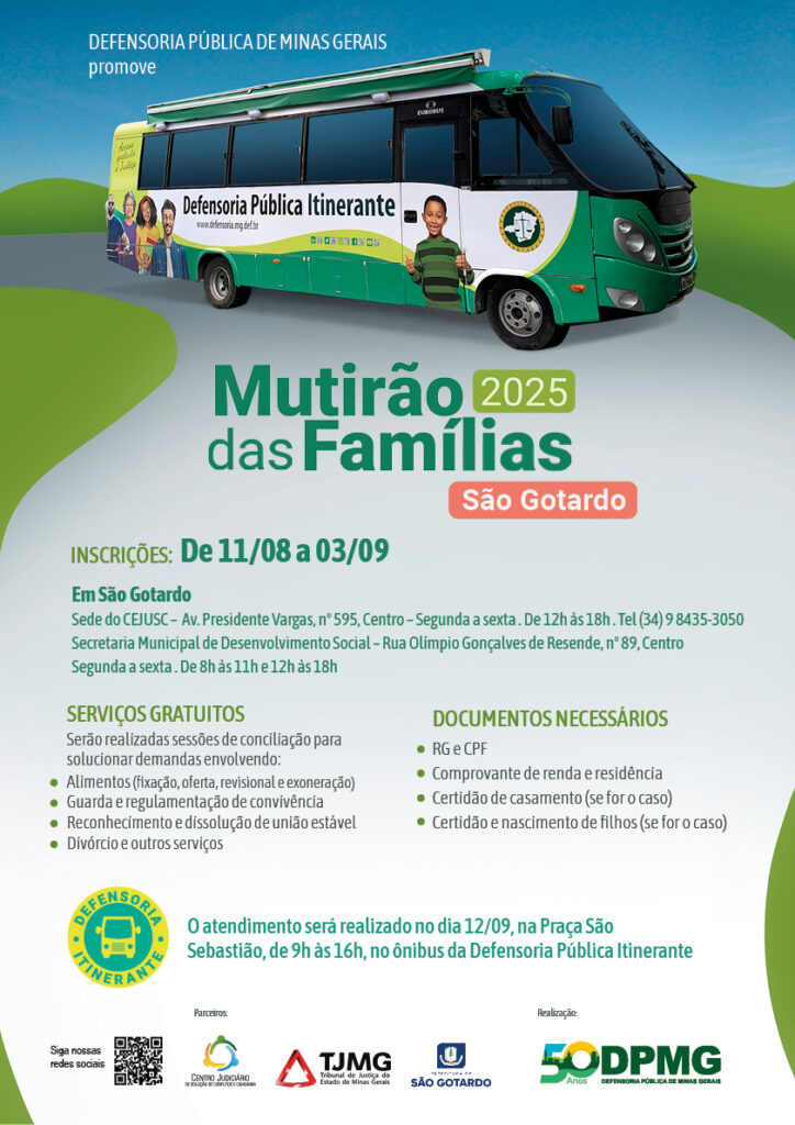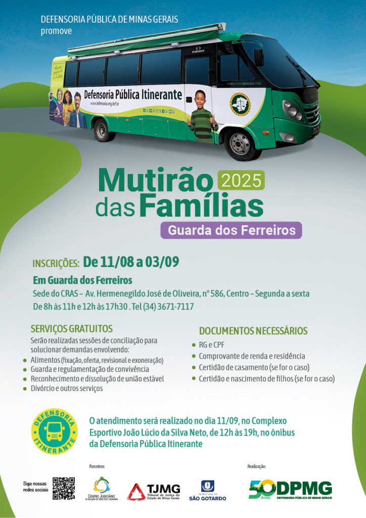 A Defensoria Pública de Minas Gerais (DPMG), por meio do seu projeto Defensoria Pública Itinerante, levará o Mutirão das Famílias para o município de São Gotardo e Distrito de Guarda dos Ferreiros, no Alto do Paranaíba.