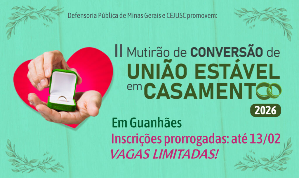 As inscrições para o II Mutirão de Conversão de União Estável em Casamento de Guanhães foram prorrogadas até o dia 13 de fevereiro.