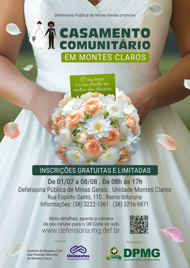 A Defensoria Pública de Minas Gerais (DPMG) irá realizar mais uma edição do Casamento Comunitário, desta vez, na Unidade de Montes Claros. A cerimônia será no dia 20 de setembro no campus universitário da Universidade Estadual de Montes Claros (Unimontes).