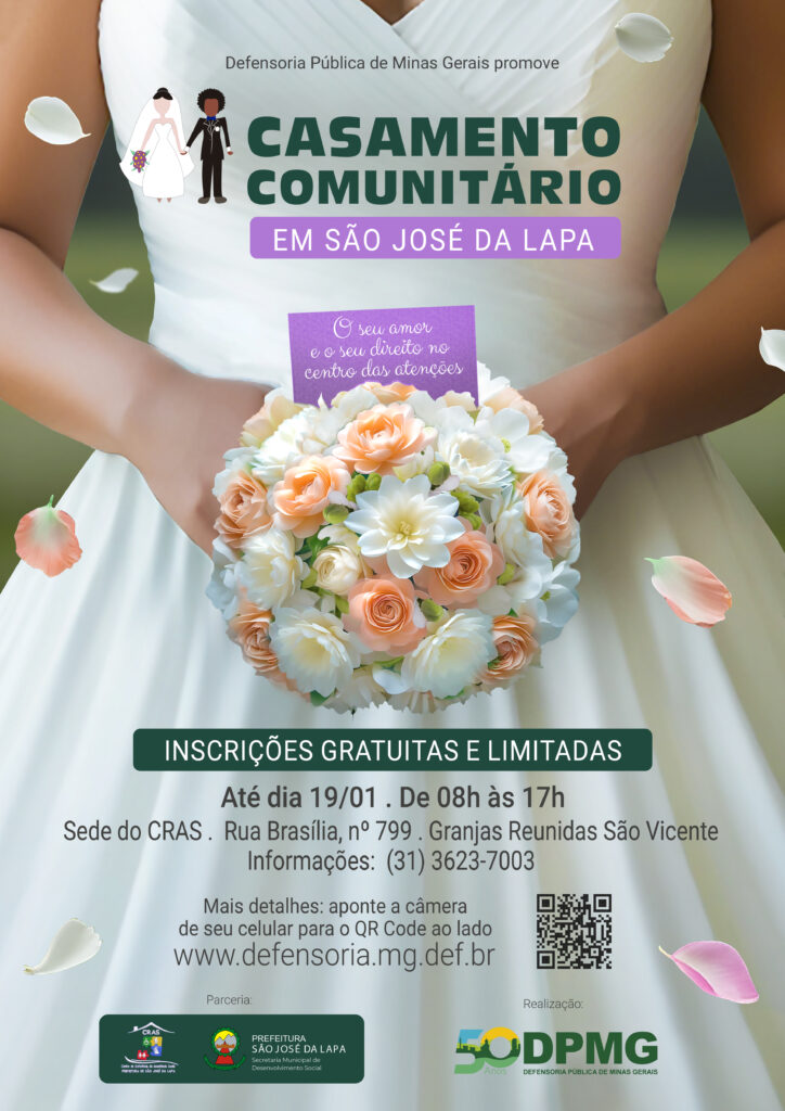 A Defensoria Pública de Minas Gerais (DPMG) promoverá uma edição do Casamento Comunitário no município de São José da Lapa, na Região Metropolitana de Belo Horizonte. A cerimônia coletiva para entrega das certidões está prevista para o dia 27 de fevereiro de 2026, no Teatro Municipal da cidade.