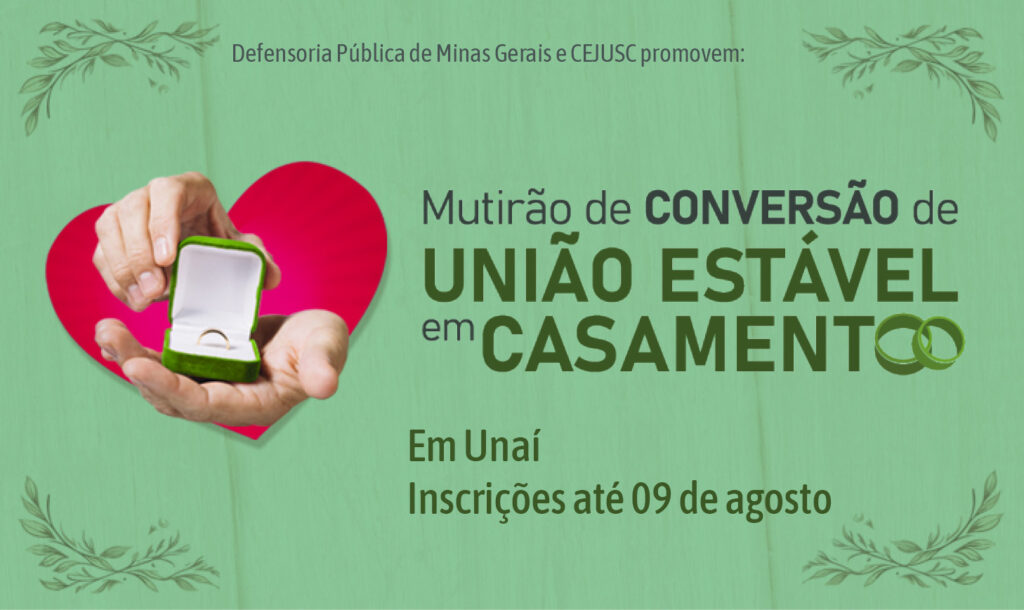 Estão abertas e vão até 9 de agosto, as inscrições para o Mutirão de Conversão de União Estável em Casamento que a Defensoria Pública mineira e o Tribunal de Justiça de Minas Gerais promoverão no município de Unaí, na região Noroeste de Minas Gerais.