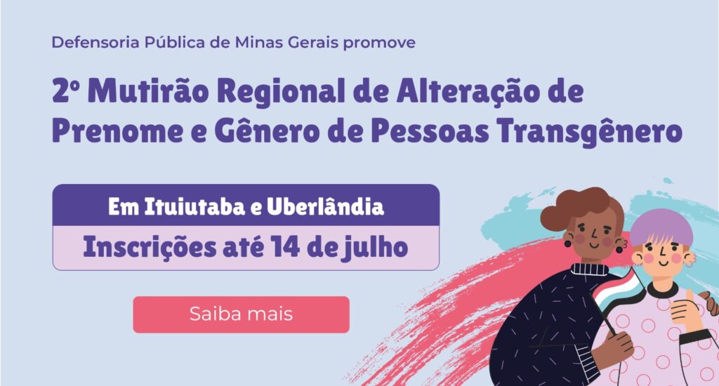 A Defensoria Pública de Minas Gerais (DPMG) está com as inscrições abertas para o “II Mutirão Regional de Retificação de Prenome e Gênero de Pessoas Transgênero – 2023”, em Uberlândia e Ituiutaba.
