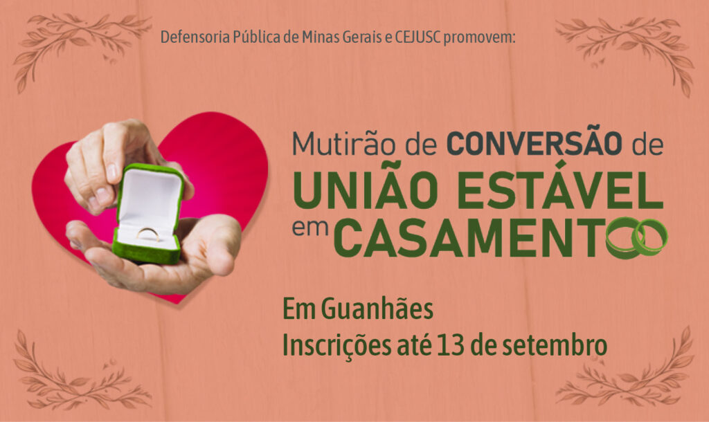 Casais moradores de Guanhães, na região leste do estado, que já vivem em união estável e desejam regularizar seu relacionamento, mas não possuem condições financeiras para arcar com as taxas do cartório, podem procurar a Unidade da Defensoria Pública de Minas Gerais (DPMG) no município para participar do Mutirão de Conversão de União Estável em Casamento. As inscrições vão até o dia 13 de setembro.