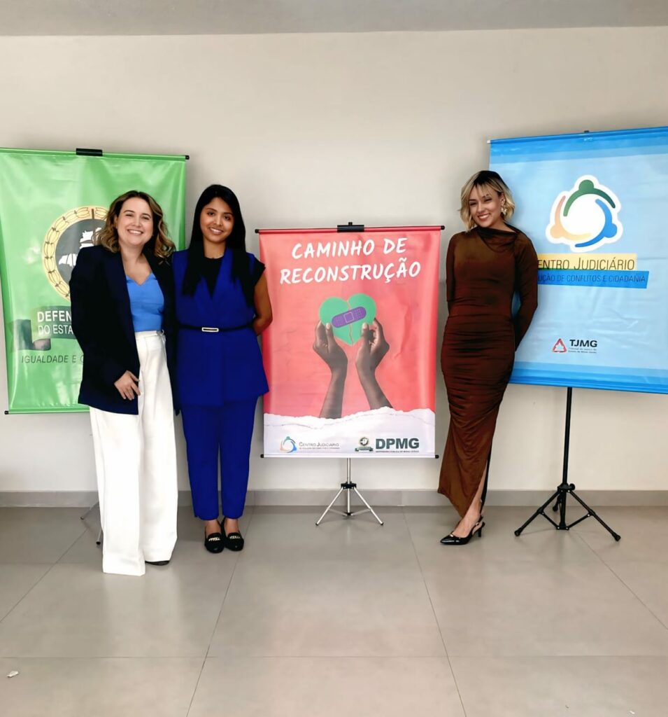 A defensora pública Juliana da Silva (à esquerda) junto da psicóloga da DPMG em Brumadinho, Brênia Oliveira Venâncio Barbosa, e a conciliadora do CEJUSC, Eduarda Santos Almeida