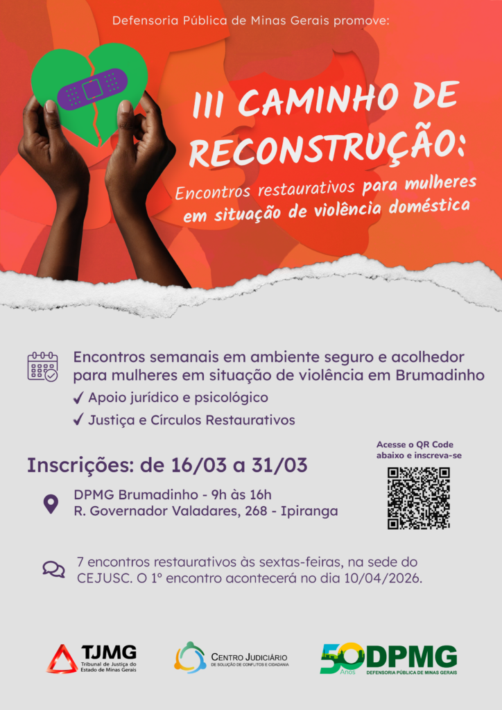 A Defensoria Pública de Minas Gerais (DPMG), em parceria com o Centro Judiciário de Solução de Conflitos e Cidadania (CEJUSC) de Brumadinho, está com inscrições abertas para a terceira edição do projeto “Caminho de Reconstrução: Encontros Restaurativos para Mulheres em Situação de Violência Doméstica”. As mulheres interessadas devem se inscrever até o dia 31 de março.