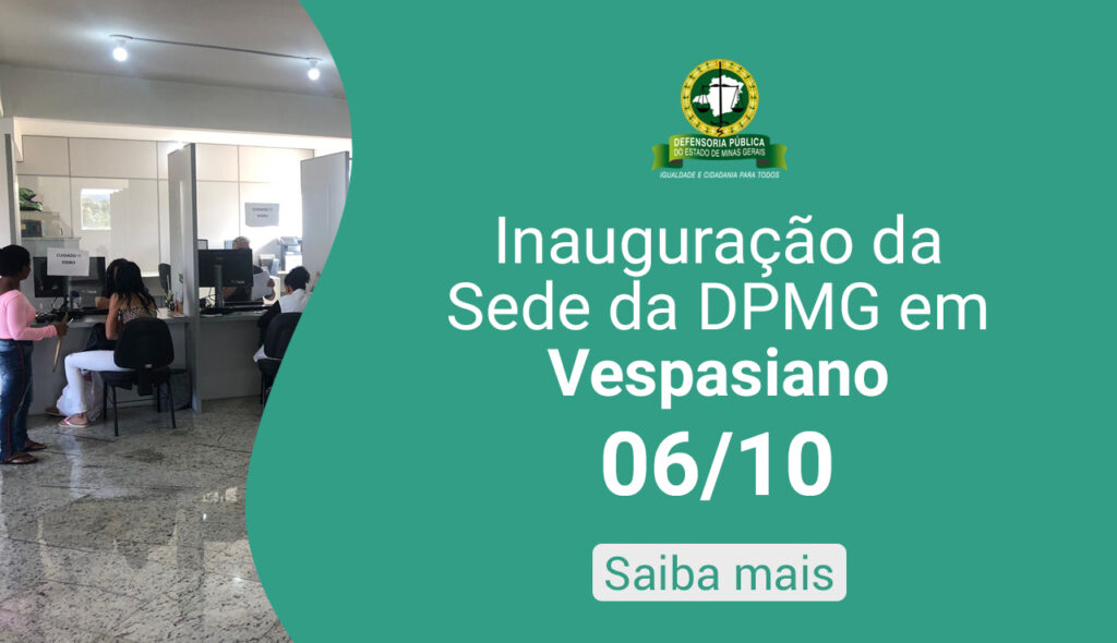 A Defensoria Pública de Minas Gerais (DPMG) vai inaugurar oficialmente a sua sede em Vespasiano, na Regional Metropolitana. A solenidade será na próxima sexta-feira (6/9), às 10h30, na Rua João Batista da Fonseca, 44, 2º andar, no Centro.