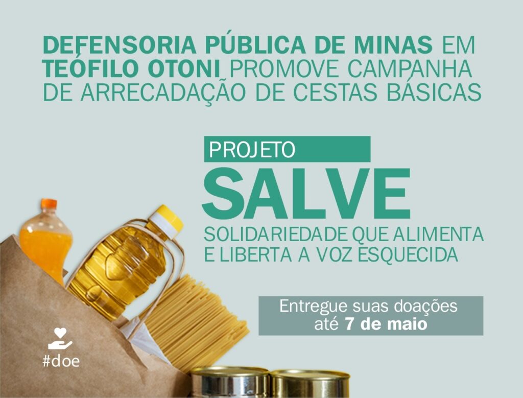 Com o nome “Salve – Solidariedade que Alimenta e Liberta a Voz Esquecida”, o projeto vai arrecadar cestas básicas que serão destinadas às famílias assistidas pela Defensoria Pública e também às famílias cadastradas nos CRAS e CREAS dos municípios que compõem a comarca de Teófilo Otoni.