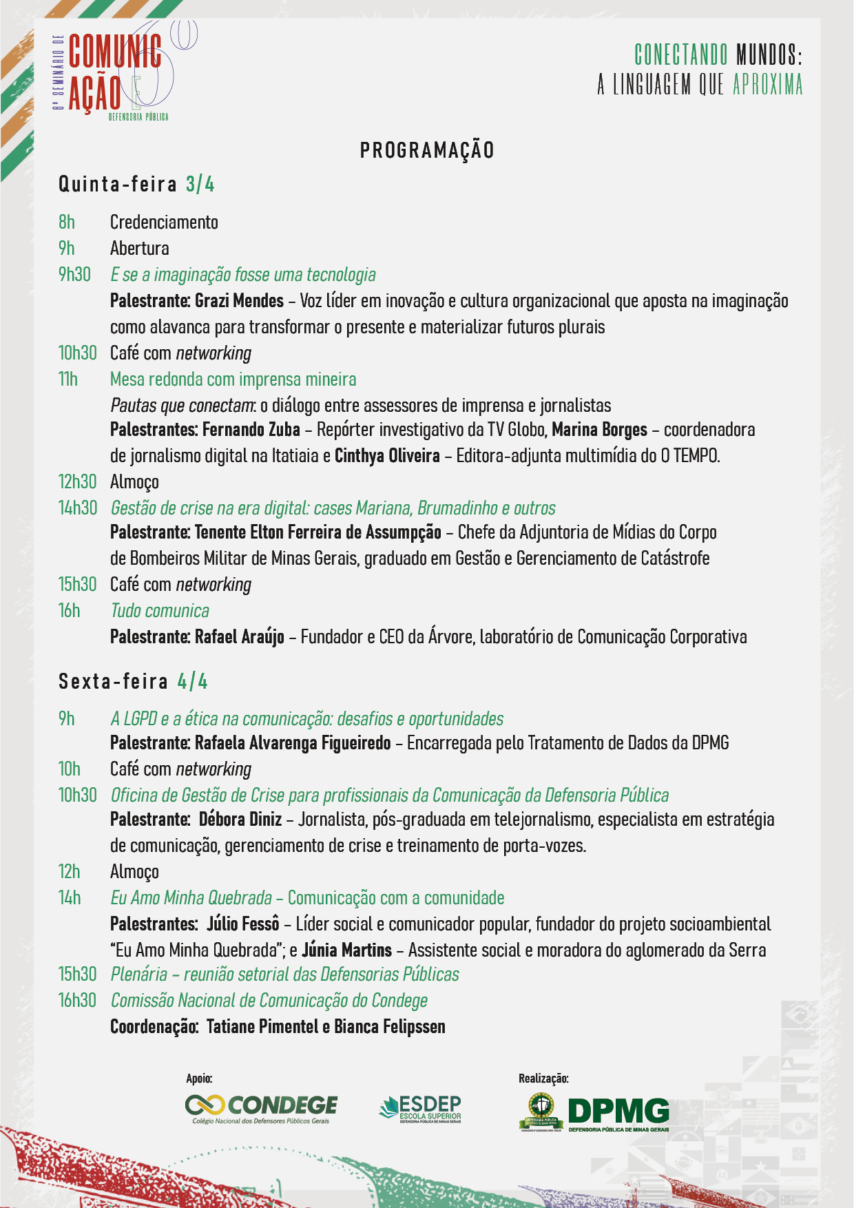 Voltado para os profissionais das Assessorias de Comunicação das Defensorias Públicas do Brasil, a edição mineira terá como tema “Conectando mundos: a linguagem que aproxima“. O evento também estará aberto à participação de defensoras e defensores públicos, colaboradoras e colaboradores da DPMG.