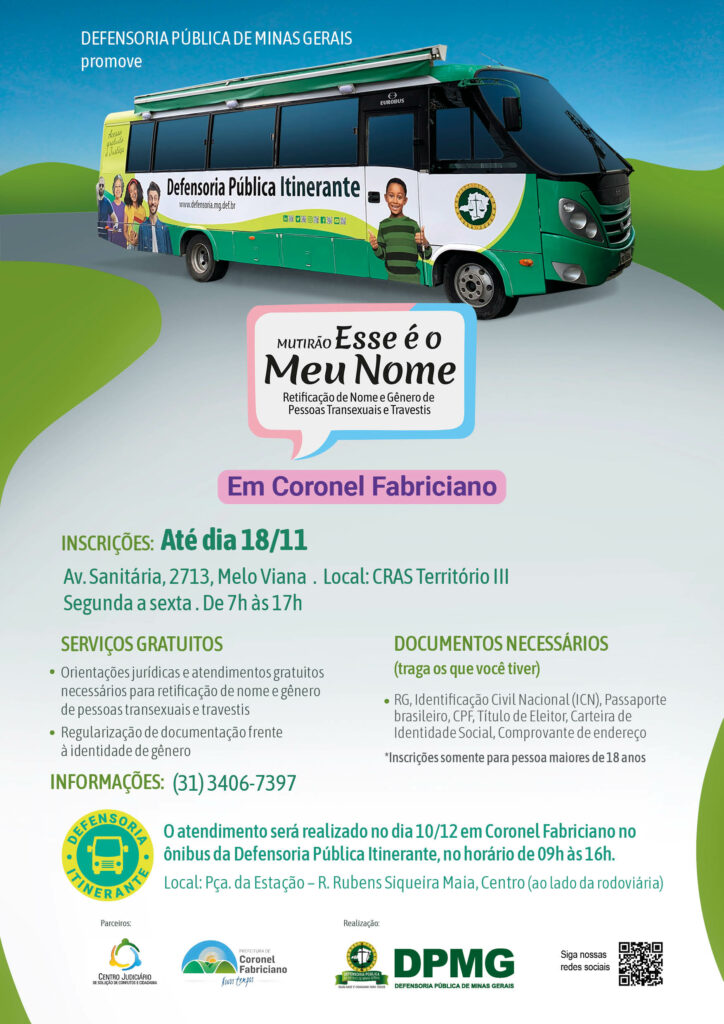 A Defensoria Pública de Minas Gerais (DPMG) levará o Mutirão Esse é o Meu Nome ao município de Coronel Fabriciano no dia 10 de dezembro. Na data, será realizado o atendimento para promover a retificação de nome e gênero para pessoas transexuais e travestis maiores de 18 anos que se inscreveram previamente.