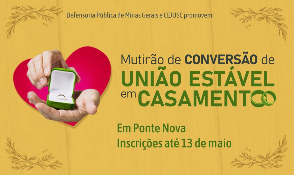 Para possibilitar que casais de Ponte Nova que já vivem juntos e desejam regularizar sua união, mas não possuem condições financeiras para arcar com os custos do casamento, a Defensoria Pública de Minas Gerais (DPMG) e o Centro Judiciário de Solução de Conflitos e Cidadania (CEJUSC) promoverão um Mutirão para converter união estável em casamento no município.
