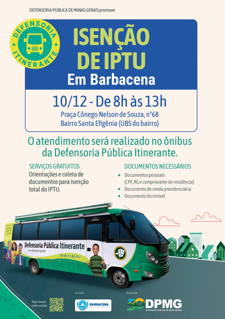 Muitas pessoas desconhecem esse direito ou encontram dificuldades para identificar a documentação necessária e para solicitar a isenção junto à Prefeitura. Durante o atendimento itinerante, defensoras, defensores públicos e servidores da Unidade da DPMG em Barbacena, juntamente com equipes da Prefeitura, prestarão orientações, coletarão os documentos e, posteriormente, a Defensoria Pública encaminhará o pedido de isenção.