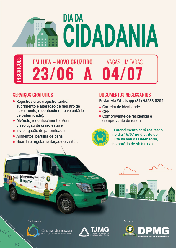 No próximo mês, os distritos Queixada e Lufa, do Município de Novo Cruzeiro, localizado no Vale do Jequitinhonha, receberão o projeto Dia da Cidadania, promovido pelo CEJUSC e pela Prefeitura Municipal, com a parceria da Defensoria Pública de Minas Gerais (DPMG).