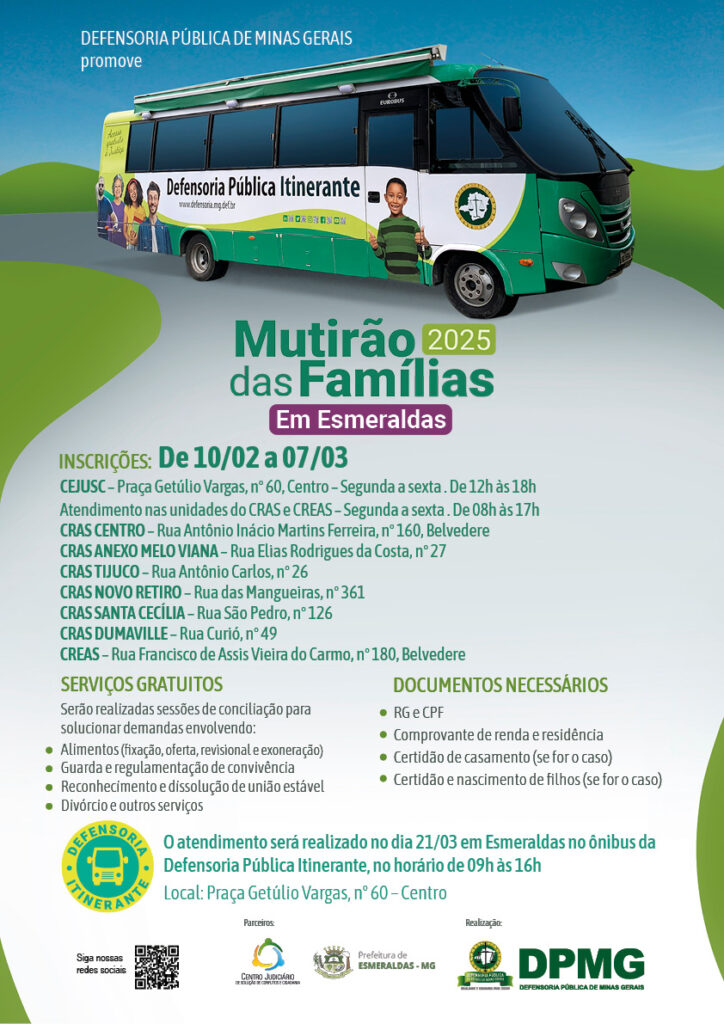 A Defensoria Pública de Minas Gerais (DPMG), por meio do seu projeto Defensoria Pública Itinerante, levará o Mutirão das Famílias ao município de Esmeraldas, Região Metropolitana de Belo Horizonte. Os atendimentos à população serão realizados no dia 21 de março, das 9h às 16h, por meio do veículo itinerante da Defensoria Pública. O local será na Praça Getúlio Vargas, 60 – Centro.