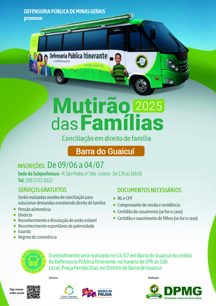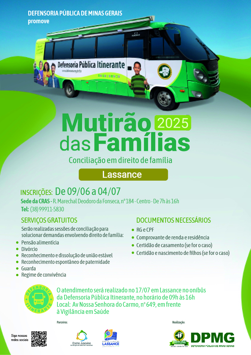 A Defensoria Pública de Minas Gerais (DPMG), por meio do seu projeto Defensoria Pública Itinerante, levará o Mutirão das Famílias aos municípios de Lassance e Várzea da Palma e no distrito de Guaicuí, na região Norte de Minas. As inscrições começam no dia 9 de junho e terminam no dia 4 de julho.