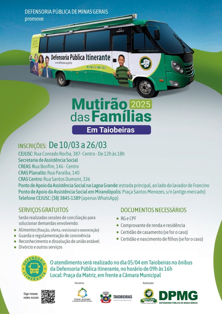 A Defensoria Pública de Minas Gerais (DPMG), por meio do seu projeto Defensoria Pública Itinerante, levará o Mutirão das Famílias ao município de Taiobeiras, região norte do estado. As inscrições ocorrem entre os dias 10 e 26 de março.