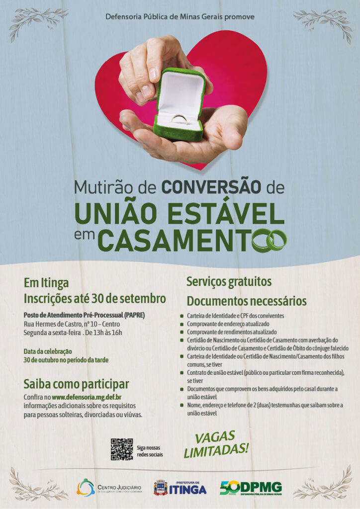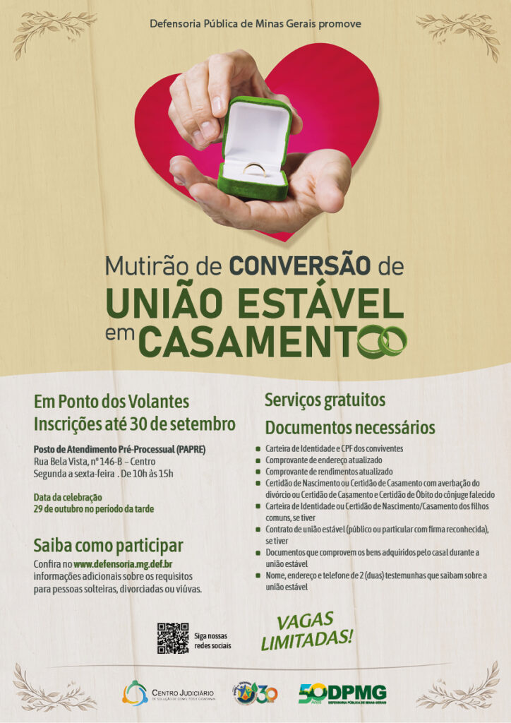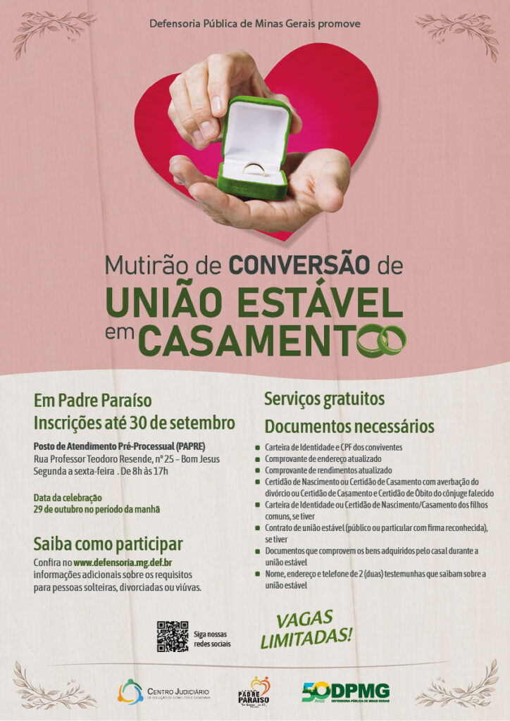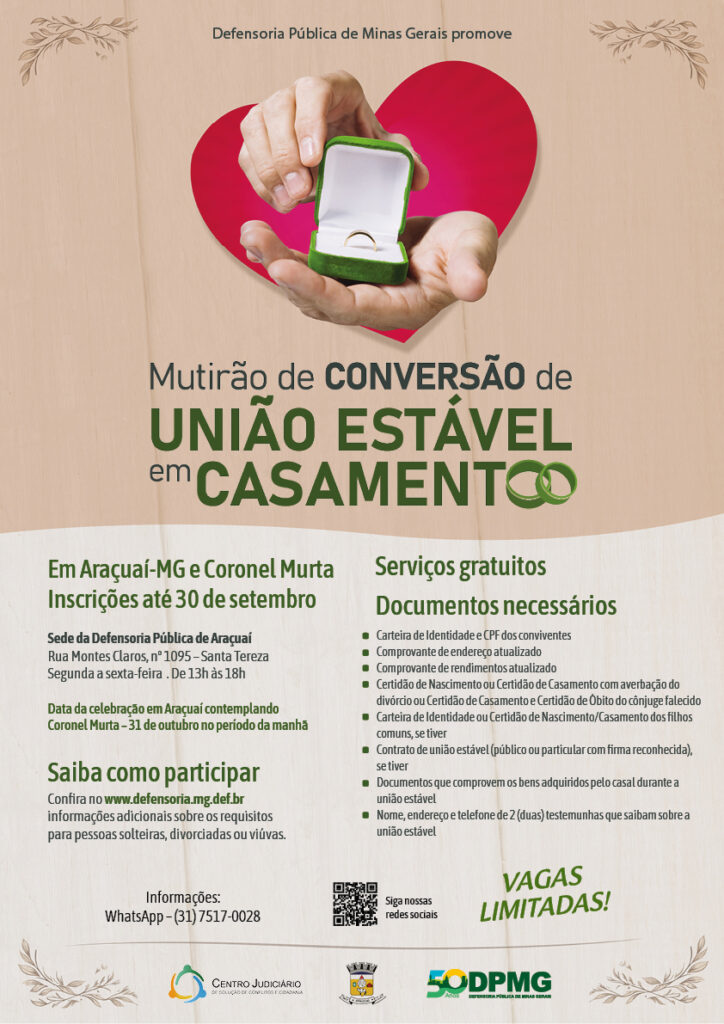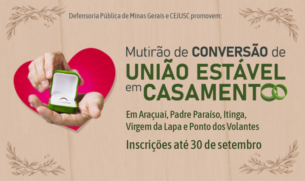 A Defensoria Pública de Minas Gerais (DPMG) vai promover mais uma edição do Mutirão de Conversão de União Estável em Casamento, desta vez na comarca de Araçuaí, que abrange os municípios de Padre Paraíso, Ponto dos Volantes, Virgem da Lapa, Itinga e Coronel Murta.