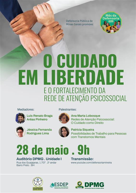 A Defensoria Pública de Minas Gerais, por meio da sua Escola Superior, em comemoração ao mês da Defensoria Pública, promove o evento “O Cuidado em Liberdade e o Fortalecimento da Rede de Atenção Psicossocial”, no dia 28 de maio, às 9h, no auditório da DPMG – Unidade I (Rua dos Guajajaras, 1.707, 2º andar, Barro Preto – BH), com transmissão ao vivo pelo canal da Defensoria no YouTube.