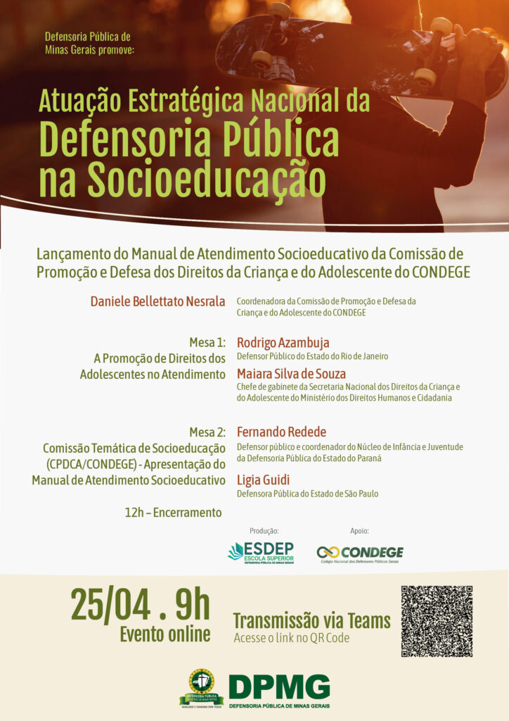 A Defensoria Pública de Minas Gerais (DPMG), por meio da sua Escola Superior (ESDEP), promove no dia 25 de abril, a partir das 9h, o evento online “Atuação Estratégica Nacional da Defensoria Pública na Socioeducação”. Ele será transmitido pela plataforma Microsoft Teams.