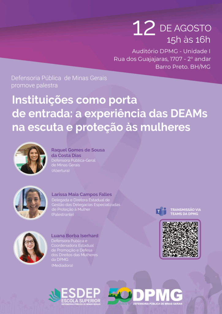 A Defensoria Pública de Minas Gerais (DPMG), por meio da sua Escola Superior (Esdep), promove no dia 12 de agosto, das 15h às 16h, a palestra “Instituições como porta de entrada: a experiência das DEAMs na escuta e proteção às mulheres”, como parte da campanha Agosto Lilás 2025.