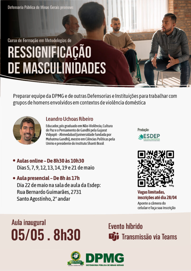 A Defensoria Pública de Minas Gerais (DPMG), por meio de sua Escola Superior (Esdep), promoverá o curso de formação em “Metodologias de Ressignificação de Masculinidades”, com o objetivo de capacitar agentes que trabalhem diretamente com grupos de homens envolvidos em contexto de violência doméstica.