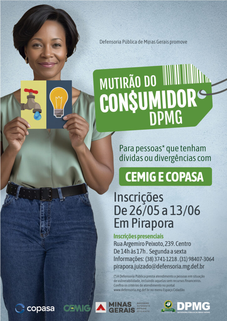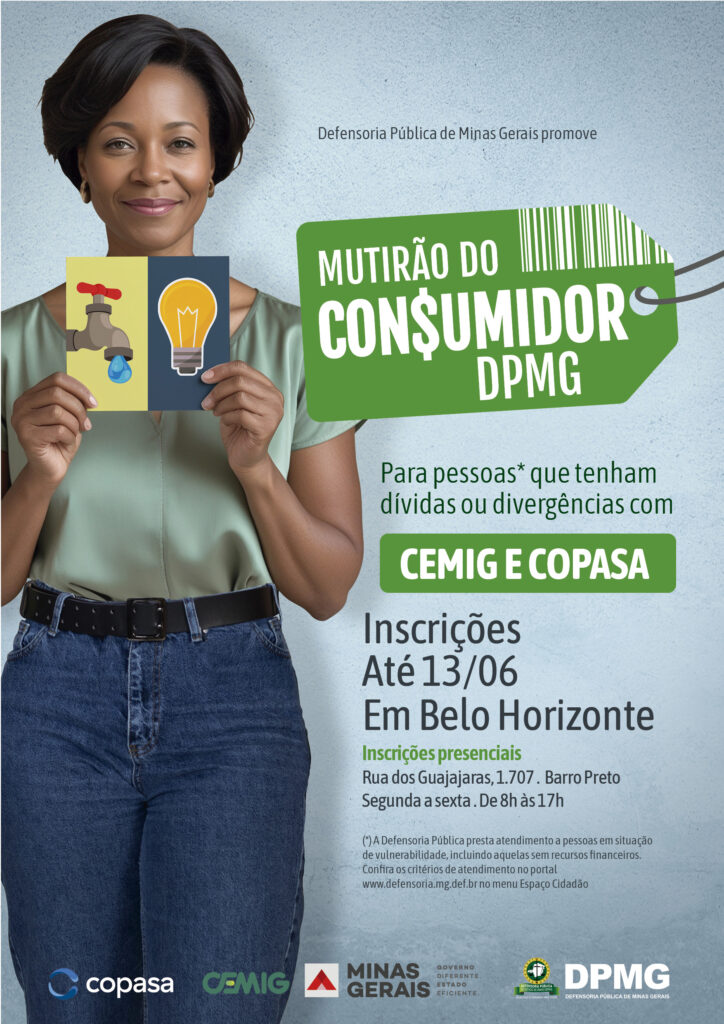 A Defensoria Pública de Minas Gerais (DPMG) abre nesta segunda-feira (26/5) as inscrições para a primeira edição do seu Mutirão do Consumidor. Pessoas com pendências nas contas da Copasa e da Cemig poderão se inscrever até 13 de junho nas seis unidades participantes (veja lista abaixo e como se inscrever). As sessões de conciliação em Belo Horizonte ocorrerão entre os dias 23 e 27 de junho.