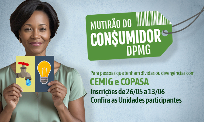 A Defensoria Pública de Minas Gerais (DPMG) abre nesta segunda-feira (26/5) as inscrições para a primeira edição do seu Mutirão do Consumidor. Pessoas com pendências nas contas da Copasa e da Cemig poderão se inscrever até 13 de junho nas seis unidades participantes (veja lista abaixo e como se inscrever). As sessões de conciliação em Belo Horizonte ocorrerão entre os dias 23 e 27 de junho.