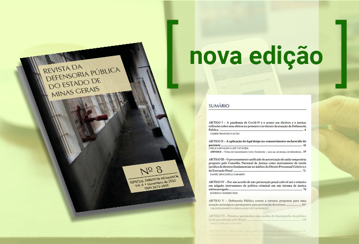 A Defensoria Pública de Minas Gerais (DPMG) lança a oitava edição da Revista da Defensoria Pública. A publicação especial homenageia a Defensoria Pública Especializada em Direitos Humanos, Coletivos e Socioambientais (DPDH), que celebrou 20 anos de atuação neste ano. A revista traz 12 artigos jurídicos que analisam questões diversas sob a ótica dos direitos humanos.
