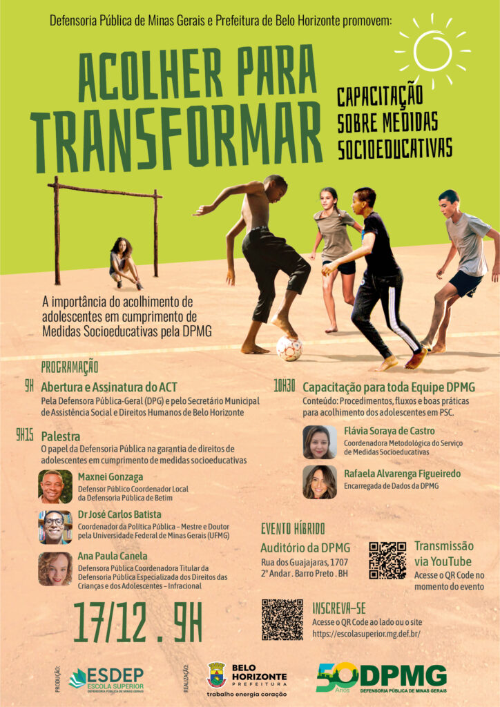 Na sequência, haverá a palestra “O papel da Defensoria Pública na garantia de direitos de adolescentes em cumprimento de medidas socioeducativas” que, entre outros aspectos, abordará a experiência da Unidade da Defensoria em Betim.