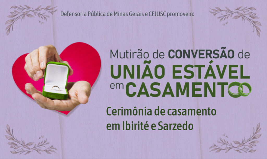 Ibirité e Sarzedo receberão uma cerimônia festiva para marcar a regularização jurídica da união de 40 casais por meio do I Mutirão de Conversão de União Estável em Casamento promovido pela Defensoria Pública de Minas Gerais na comarca de Ibirité. Na ocasião, os casais receberão a certidão de casamento.