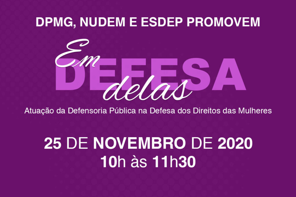 A Defensoria Pública de Minas Gerais (DPMG), por meio da sua Escola Superior (Esdep-MG) realizará, no dia 25 de novembro, a partir das 10 horas, a palestra “Em Defesa Delas: A Atuação da Defensoria Pública na Defesa dos Direitos das Mulheres.”