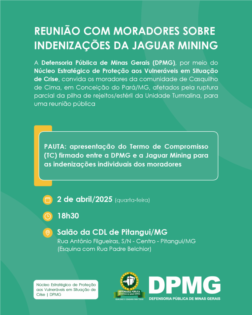 A Defensoria Pública de Minas Gerais (DPMG), por meio do Núcleo Estratégico de Proteção aos Vulneráveis em Situação de Crise, fará uma reunião com os moradores da comunidade de Casquilho de Cima, povoado de Conceição do Pará, afetados pela ruptura parcial da pilha de rejeitos/estéril da Unidade Turmalina, da mineradora Jaguar Mining.
