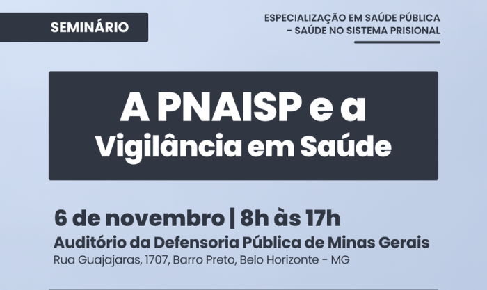 A Defensoria Pública de Minas Gerais (DPMG) sediará, no dia 6 de novembro, o seminário “A PNAISP e a Vigilância em Saúde”, promovido pela Escola de Saúde Pública do Estado de Minas Gerais (ESP-MG), com o apoio da Escola Superior da DPMG (Esdep-MG). O evento será realizado das 8h às 17h, no auditório da Defensoria Pública (Rua Guajajaras, 1707, Barro Preto, Belo Horizonte).