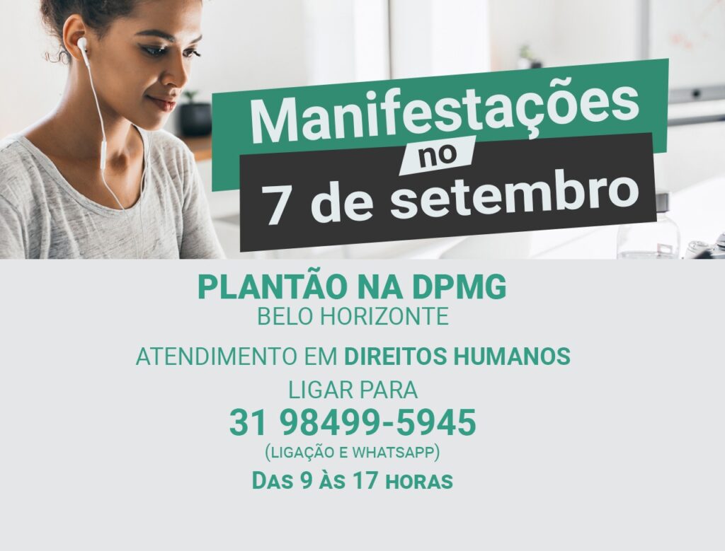 No dia 7 de setembro, em que estão programadas manifestações populares, a Defensoria Especializada em Direitos Humanos, Coletivos e Socioambientais estará de plantão, de 9 às 17 horas, em Belo Horizonte, para fins de orientações e eventuais providências relacionadas ao exercício dos direitos de reunião e de livre manifestação do pensamento. O atendimento será realizado por chamada ou whatsapp, no número (31) 98499-5945.