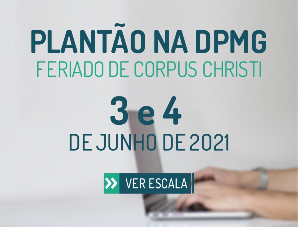 Conforme as Resoluções nº40, nº58 e nº70 de 2021, a Defensoria Pública funcionará em regime de plantão de Corpus Christi nos dias 3 e 4 de junho (quinta e sexta-feira) na comarca de Belo Horizonte e nas comarcas do interior do estado em que o dia de Corpus Christi for feriado municipal.
