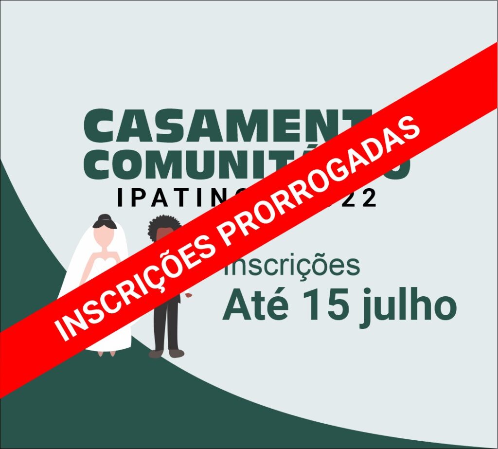 Foram prorrogadas até o dia 15 de julho as inscrições para o Casamento Comunitário que a Defensoria Pública de Minas Gerais (DPMG) vai promover em Ipatinga, no Vale do Aço, região leste do estado. A iniciativa é para casais residentes no município e que sonham se casar, mas não têm condições de arcar com as taxas dos cartórios.