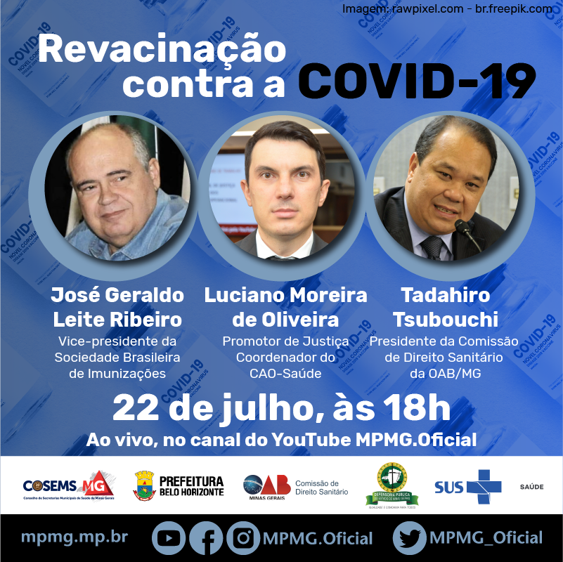 Com o apoio da Defensoria Pública de Minas Gerais, o Ministério Público/MG promove nesta quinta-feira (22/7), às 18 horas, uma live com o tema “Revacinação: mitos, verdades e aspectos jurídicos”. O encontro será transmitido no canal do MPMG Oficial no YouTube. Clique aqui .