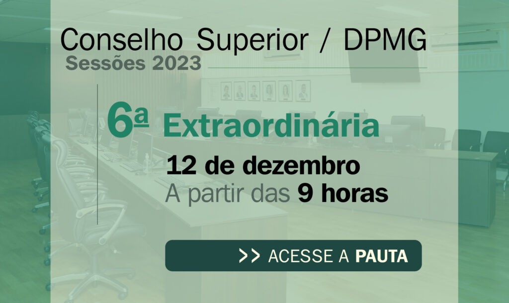 6ª sessão extraordinária – No dia 12 de dezembro (terça-feira), a partir das 9 horas, as membras e membros do Conselho Superior da Defensoria Pública do Estado de Minas Gerais reunir-se-ão para realizar a 6ª sessão extraordinária do ano de 2023.