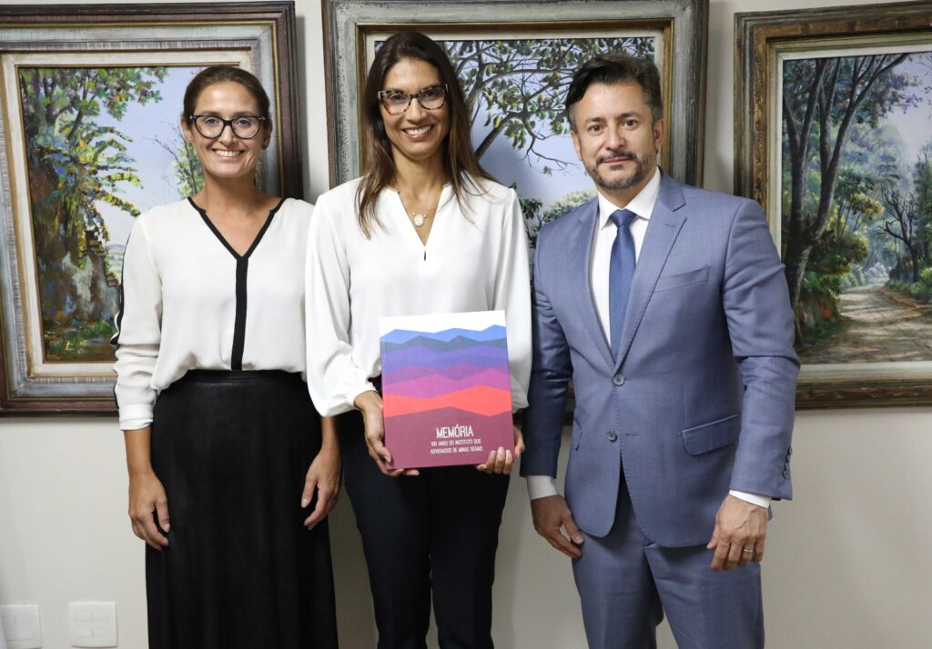Durante o encontro, o presidente presenteou a DPG com a publicação comemorativa do centenário do Instituto: “Memória – 100 anos do Instituto dos Advogados de Minas Gerais”.